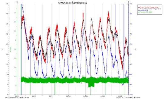The graph of the full length of the report clearly shows the dew point trends with both ambient and gas temperature with little effect from pressure. This is counterintuitive because dew point does not vary with temperature, only pressure. The dew point fluctuations must be coming from the point of nitrogen generation.