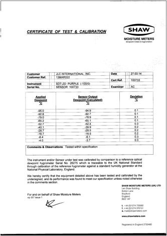 point was monitored using a Shaw model SDT Dewpoint Transmitter installed at